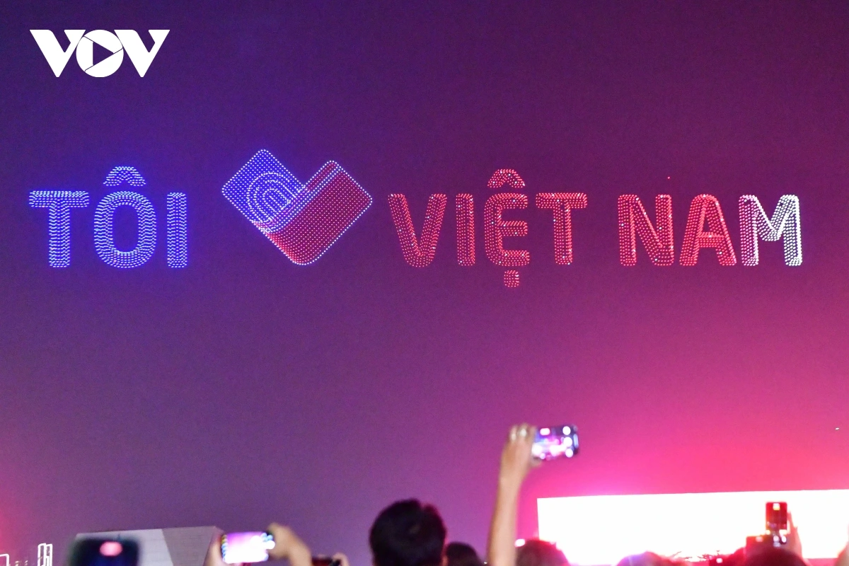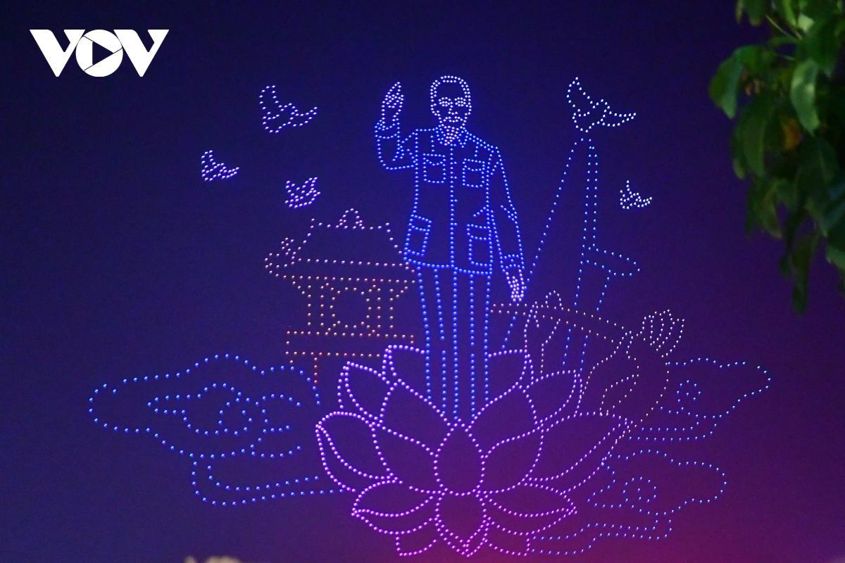 Trong buổi tổng duyệt kéo dài 15 phút, các drone bay trên cao và xếp thành những hình ảnh mang biểu tượng thể hiện quá trình phát triển của TP.HCM và chào mừng 50 năm thống nhất đất nước.