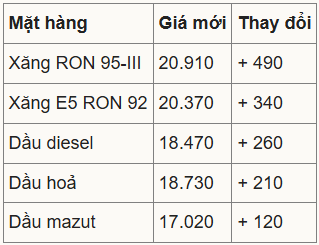 Giá xăng RON 95-III (loại phổ biến trên thị trường) tăng 490 đồng, lên 20.910 đồng một lít. E5 RON 92 thêm 340 đồng, ở mức 20.370 đồng. Tương tự, các mặt hàng dầu c