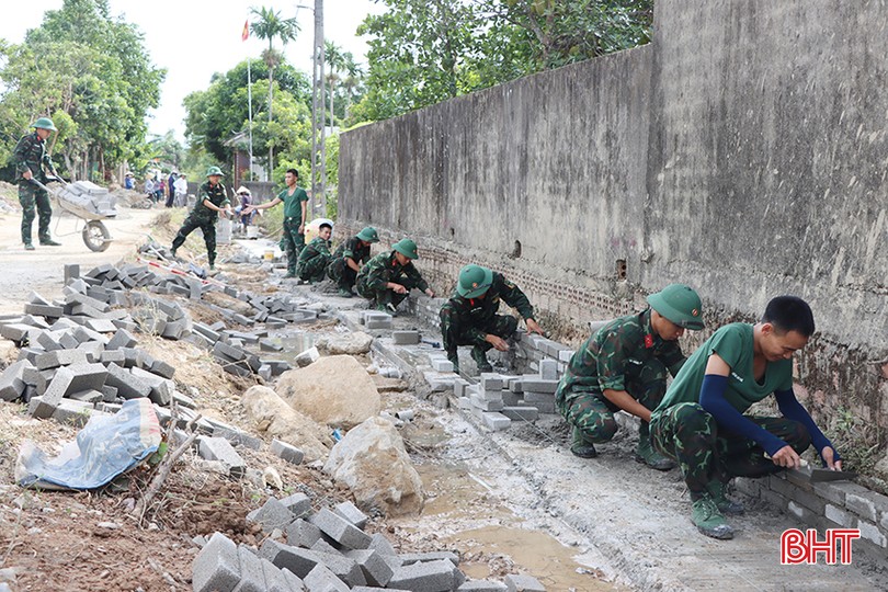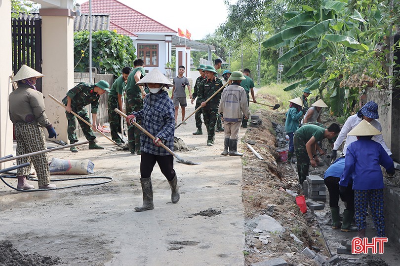 Cán bộ, chiến sĩ Trung đoàn 841 (Bộ CHQS tỉnh) hỗ trợ người dân xã Cẩm Quang xây dựng NTM.