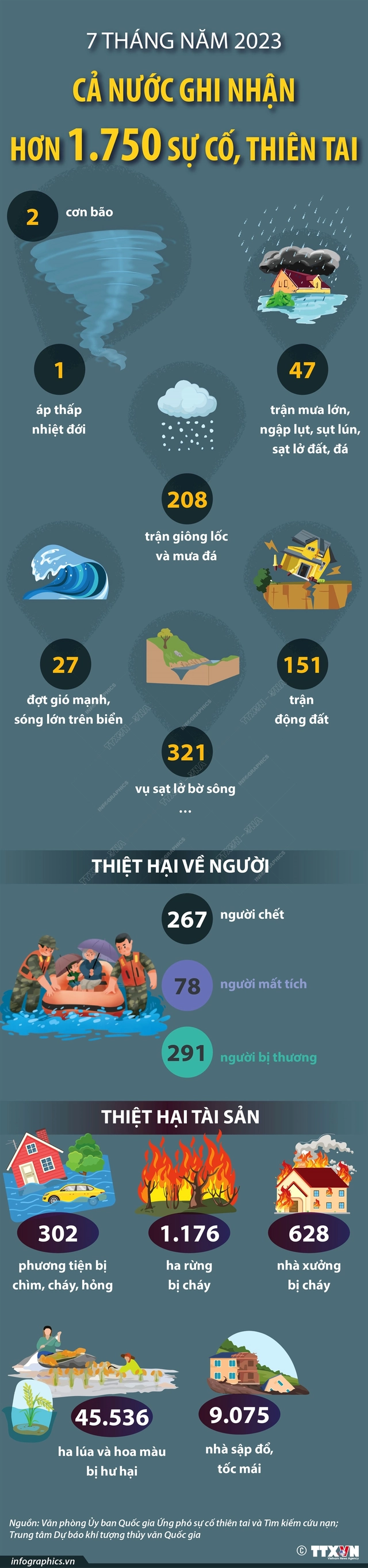 Do tác động của biến đổi khí hậu toàn cầu và sự phát triển kinh tế xã hội trên các vùng miền, tình hình thời tiết, khí hậu 7 tháng năm 2023 trên cả nước diễn biến phức tạp, đặc biệt là nắng nóng, mưa lũ, sạt lở đất ở khu vực vùng núi phía Bắc, miền Trung và Tây Nguyên. Trong 7 tháng năm 2023, cả nước ghi nhận 1.753 sự cố, thiên tai, làm chết 267 người, mất tích 78 người, bị thương 291 người; chìm, cháy, hỏng 302 phương tiện; cháy 628 nhà xưởng, 1.176 ha rừng; làm sập đổ, tốc mái 9.075 nhà, hư hại 45.536 ha lúa và hoa màu...