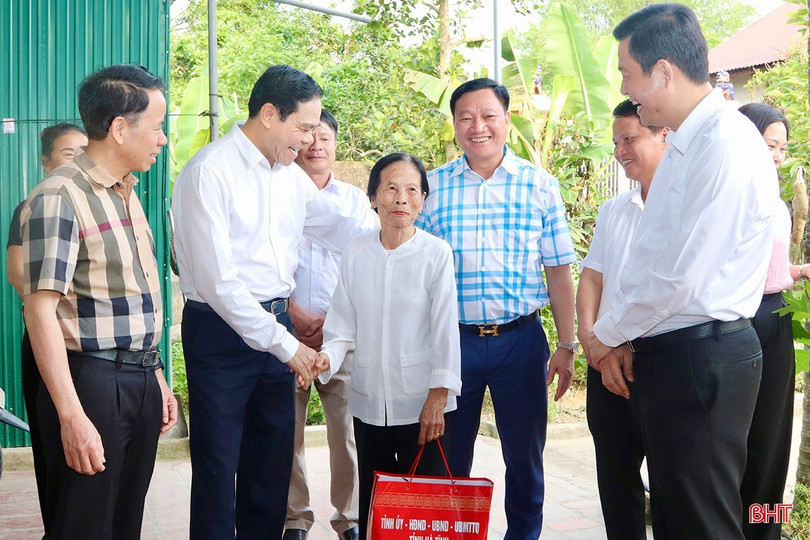 Chủ tịch UBND tỉnh Võ Trọng Hải thăm hỏi, tặng quà Mẹ Việt Nam anh hùng Nguyễn Thị Ngụ (SN 1933, trú thôn Triều Đông, xã Bùi La Nhân, có con trai Nguyễn Viết Hồng là liệt sỹ) vào dịp Kỷ niệm 50 năm Ngày Giải phóng miền Nam, thống nhất đất nước (30/4/1975 - 30/4/2025). Ảnh BHT.