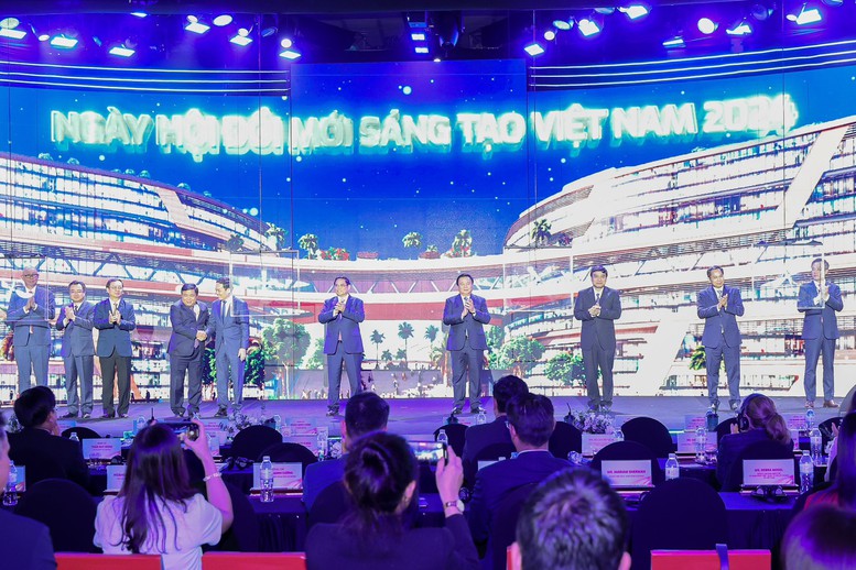 Thủ tướng Phạm Minh Chính và các đại biểu thực hiện nghi thức khai mạc Ngày hội Đổi mới sáng tạo Việt Nam 2024 và lễ kỷ niệm 5 năm thành lập Trung tâm Đổi mới sáng tạo Quốc gia - Ảnh: VGP