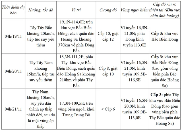 Ngày và đêm 19/11, khu vực Bắc Biển Đông (bao gồm vùng biển quần đảo Hoàng Sa) gió Đông Bắc mạnh cấp 6-7; riêng vùng biển phía Tây có gió mạnh cấp 7, vùng gần tâm bão đi qua cấp 8-11, giật cấp 14; sóng biển cao 3,0-5,0m, vùng gần tâm bão 5,0-7,0m; biển động dữ dội. Ở vịnh Bắc Bộ, vùng biển từ Quảng Trị đến Quảng Ngãi gió Đông Bắc cấp 6, giật cấp 7-8; sóng biển cao từ 2,0-5,0m; biển động.