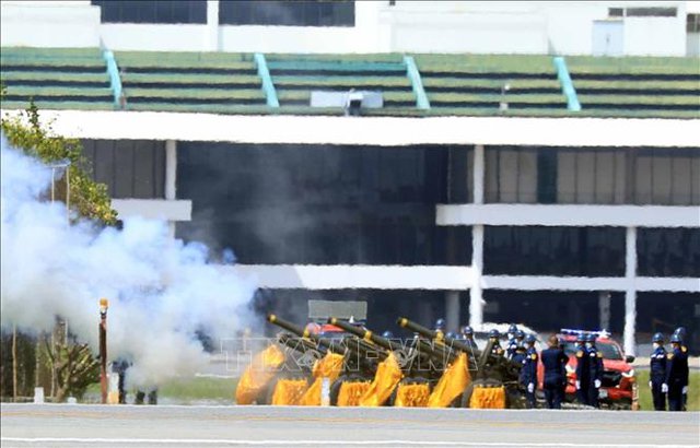 Chính phủ Thái Lan tổ chức nghi thức bắn đại bác chào đón Chủ tịch nước Nguyễn Xuân Phúc và Phu nhân sang thăm chính thức Vương quốc Thái Lan tại Sân bay Không quân Hoàng gia - Ảnh: TTXVN