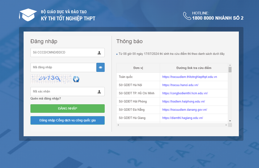 Cách 1: Tra cứu điểm thi qua website của Bộ Giáo dục và Đào tạo