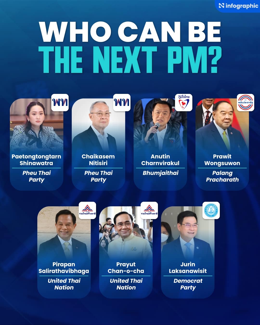 Những ứng cử viên tiềm năng khác bao gồm Phó Thủ tướng, Bộ trưởng Năng lượng Pirapan Salirathavibhaga, Chủ tịch Đảng Quốc gia Thái thống nhất và Tướng Prawit Wongsuwon, người đứng đầu Đảng Quyền lực Nhà nước nhân dân (PPRP).