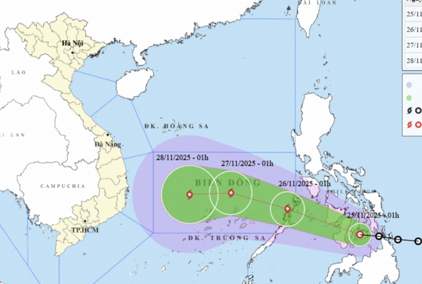 Theo Trung tâm Dự báo khí tượng thủy văn quốc gia, vào rạng sáng 25/11, tâm áp thấp nhiệt đới trên khu vực miền Trung Philippines với cường độ cấp 7 (50-61km/h), giậ