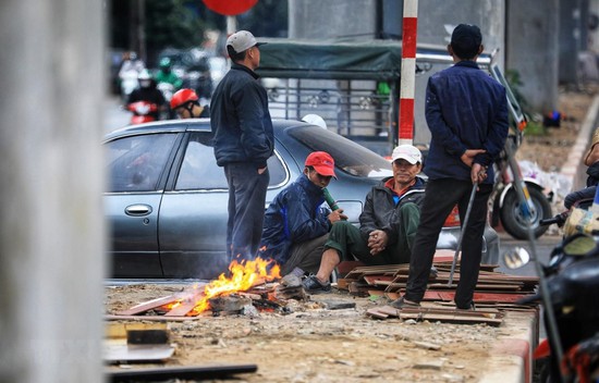 Người lao động đốt củi sưởi ấm khi nhiệt độ xuống thấp. (Ảnh: Thành Đạt/TTXVN)