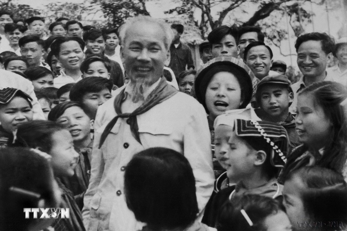 Chủ tịch Hồ Chí Minh đến thăm Trường thiếu nhi các dân tộc vùng cao Việt Bắc ở Thái Nguyên (13/3/1960). (Ảnh: TTXVN)