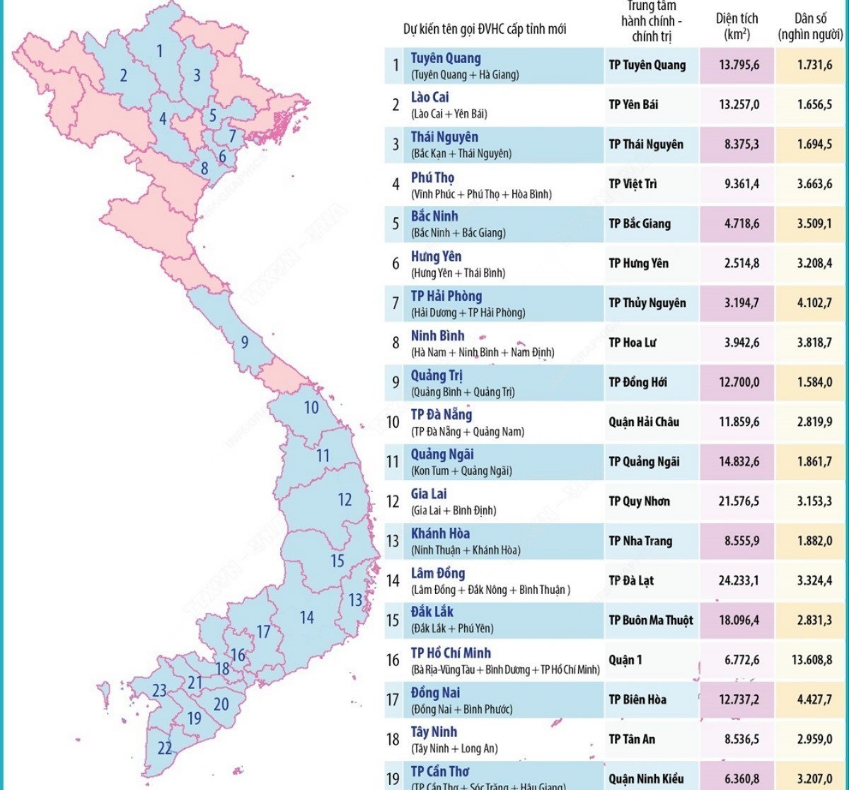 Diện tích và dân số của 23 đơn vị hành chính cấp tỉnh sau sáp nhập