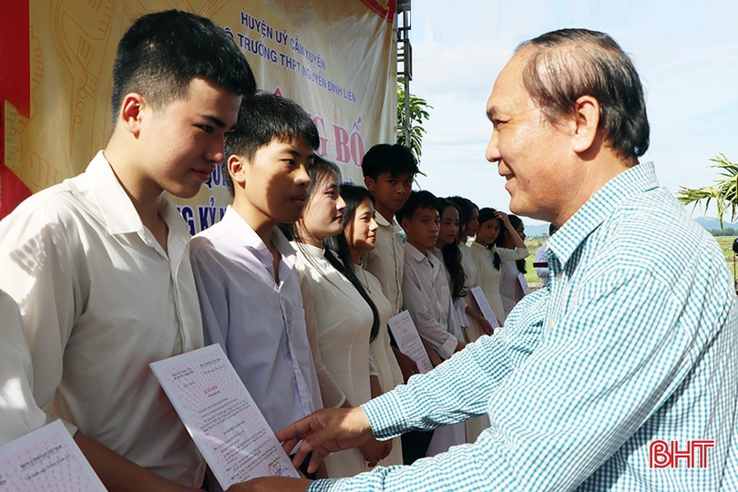 Trưởng ban Tổ chức Tỉnh ủy Võ Hồng Hải trao quyết định kết nạp Đảng cho các đảng viên mới của Trường THPT Nguyễn Đình Liễn (Cẩm Xuyên)