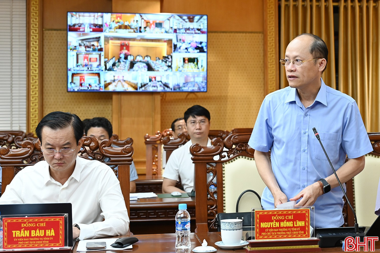 Phó Chủ tịch Thường trực UBND tỉnh Nguyễn Hồng Lĩnh báo cáo tại cuộc họp.(ảnh: BHT)