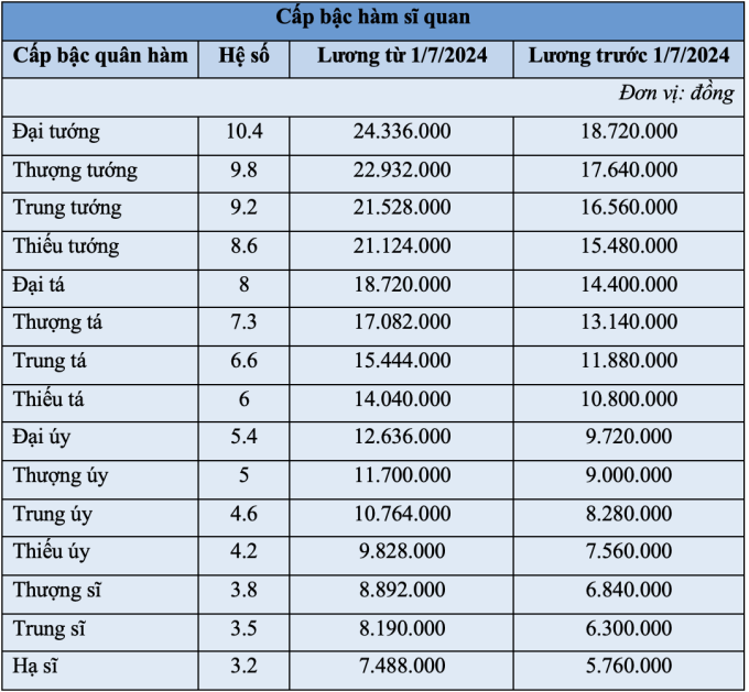Người mang hàm đại tướng từ 1/7 được hưởng mức lương cao nhất là 24,3 triệu đồng, cao hơn lương hiện hưởng 5,6 triệu đồng. Thiếu tướng, trung tướng, thượng tướng nhận mức lương mới lần lượt là 21,1 - 21,5 - 22,9 triệu đồng.