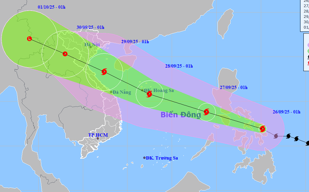 Khoảng 1h ngày mai, bão sẽ vào Biển Đông với sức gió mạnh nhất cấp 11, giật tăng ba cấp và trở thành cơn bão thứ 10. Bão sau đó giữ hướng và tốc độ, đến 1h ngày 28/9 ở giữa Biển Đông, sức gió mạnh nhất cấp 12, giật cấp 15.