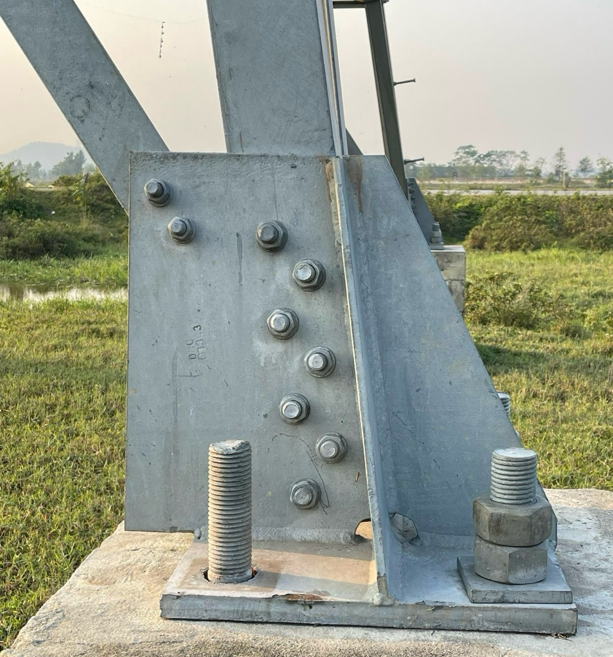 Hình ảnh cột điện bị kẻ gian tháo trộm bu lông neo định vị giữa móng cột với tấm đế chân cột thép đơn thân.