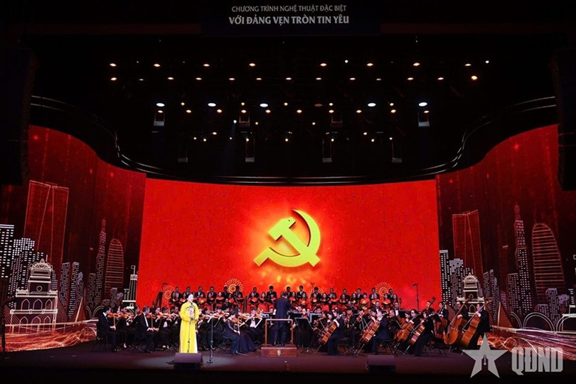 Chương trình nghệ thuật đặc biệt “Với Đảng vẹn tròn tin yêu” chào mừng kỷ niệm 95 năm Ngày thành lập Đảng Cộng sản Việt Nam. (Ảnh Báo QĐND)