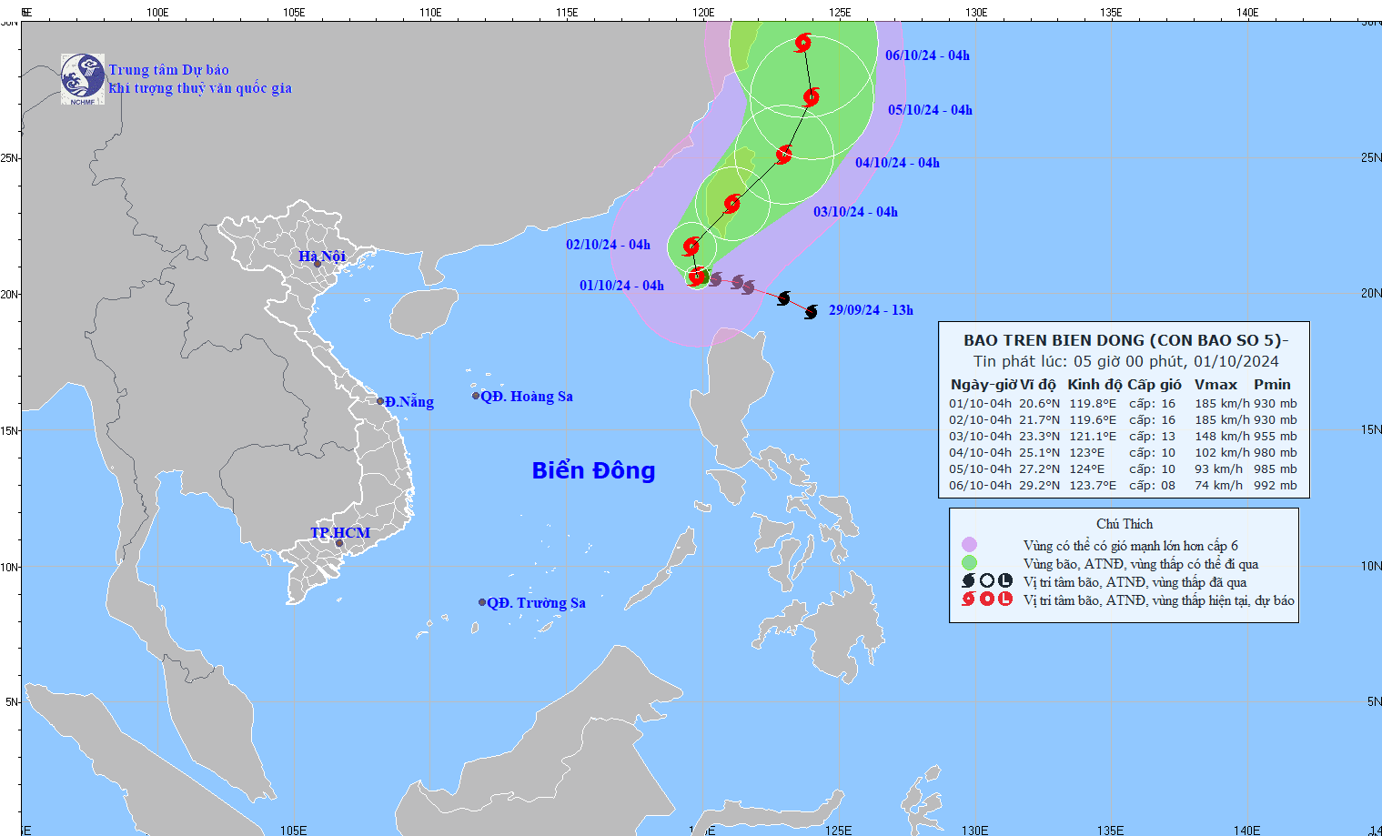 Vị trí và hướng di chuyển của bão Krathon (bão số 5) lúc 5h sáng 1/10/2024.