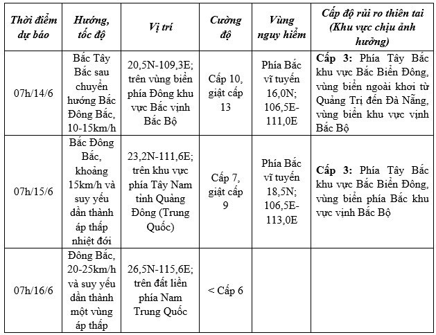 Theo Trung tâm Dự báo khí tượng thủy văn quốc gia, hồi 7 giờ ngày 13/6, vị trí tâm bão ở vào khoảng 18,2 độ Vĩ Bắc; 108,7 độ Kinh Đông, trên vùng biển phía Tây Nam đảo Hải Nam (Trung Quốc). Sức gió mạnh nhất vùng gần tâm bão mạnh cấp 10 (89-102km/h), giật cấp 13; di chuyển theo hướng Bắc Tây Bắc với tốc độ 10-15km/h.