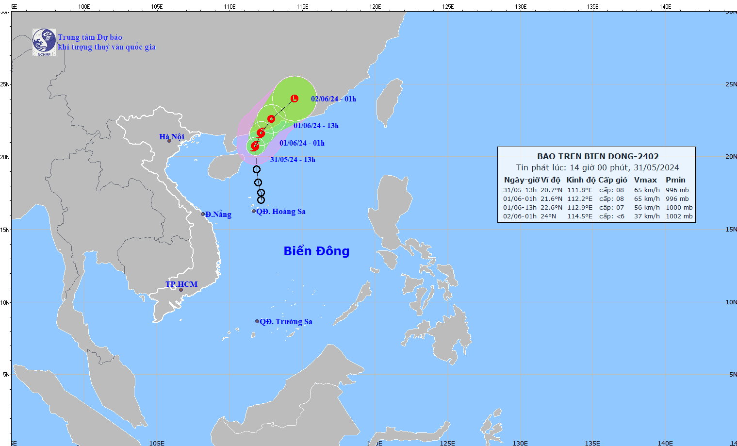 Vị trí và hướng di chuyển của cơn bão số 1 lúc 14h chiều 31/5/2024.