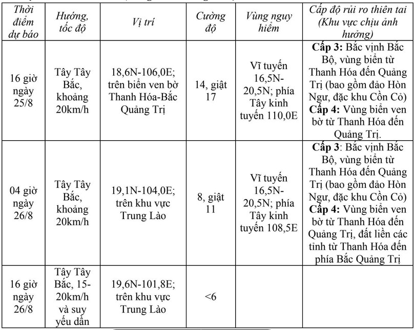 Theo dự báo mới nhất của Trung tâm Dự báo khí tượng thủy văn quốc gia: Hồi 7h ngày 25/8, vị trí tâm bão ở vào khoảng 18.4 độ Vĩ Bắc; 107.2 độ Kinh Đông, cách Nghệ An khoảng 160 km về phía Đông Đông Nam, cách Hà Tĩnh khoảng 145 km về phía Đông, cách Bắc Quảng Trị khoảng 155 km về phía Đông Đông Bắc. Sức gió mạnh nhất: Cấp 14 (150-166 km/h), giật cấp 17. Dự báo: Trong 3 giờ tới, bão di chuyển theo hướng Tây Tây Bắc, tốc độ khoảng 15-20 km/h.