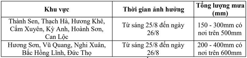 Từ sáng 25/8 đến ngày 26/8, khu vực tỉnh Hà Tĩnh có mưa to đến rất to và rải rác có dông. Lượng mưa phổ biến từ 200-400mm, cục bộ có nơi trên 600mm (mưa lớn tập trung từ gần sáng ngày 25/8 đến tối ngày 25/8). Cảnh báo nguy cơ mưa có cường suất lớn (>200 mm/3h).