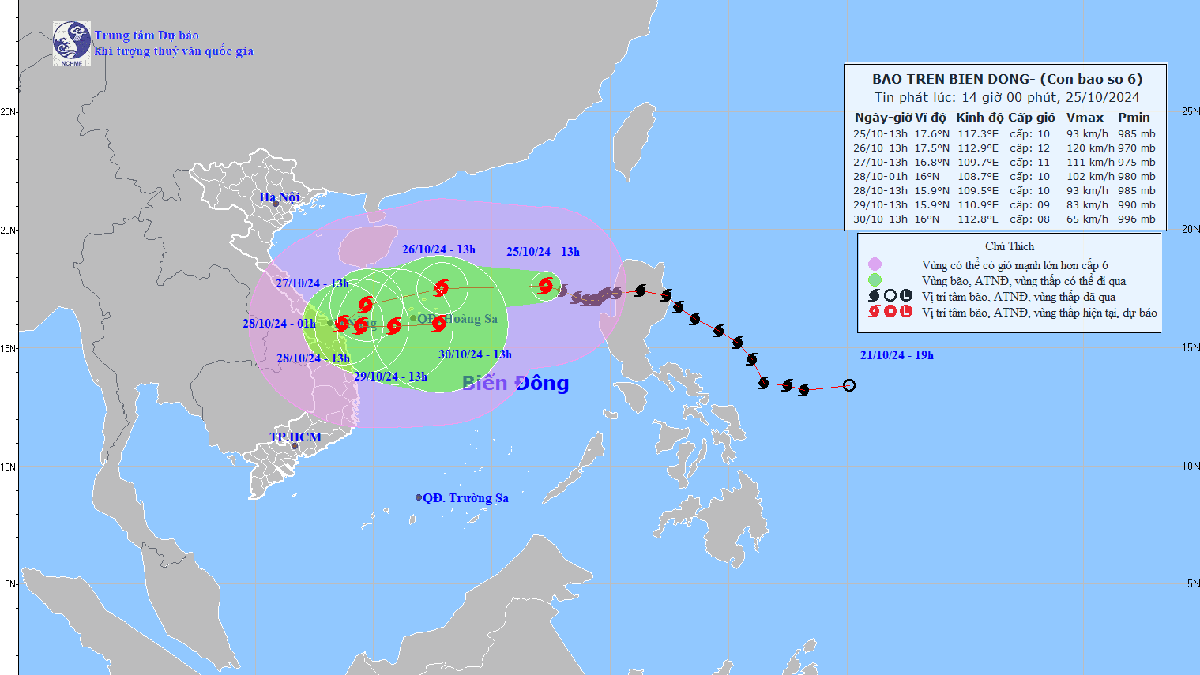 Theo Trung tâm dự báo khí tượng thủy văn quốc gia, hồi 13 giờ ngày 25/10, vị trí tâm bão ở vào khoảng 17,6 độ Vĩ Bắc; 117,3 độ Kinh Đông, trên vùng biển phía Đông