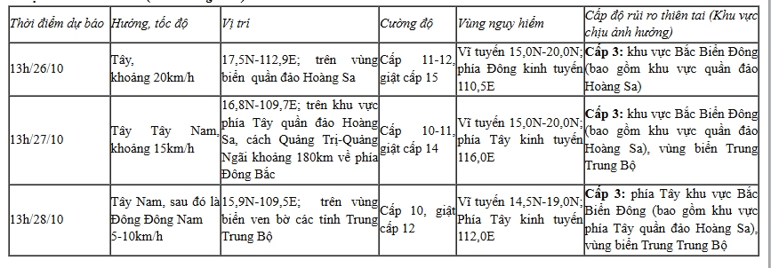 Theo Trung tâm dự báo khí tượng thủy văn quốc gia, hồi 13 giờ ngày 25/10, vị trí tâm bão ở vào khoảng 17,6 độ Vĩ Bắc; 117,3 độ Kinh Đông, trên vùng biển phía Đông của khu vực Bắc Biển Đông, cách quần đảo Hoàng Sa khoảng 560km về phía Đông Đông Bắc. Sức gió mạnh nhất vùng gần tâm bão mạnh cấp 10 (89-102km/h), giật cấp 12. Di chuyển theo hướng Tây Tây Bắc, tốc độ 15-20km/h.