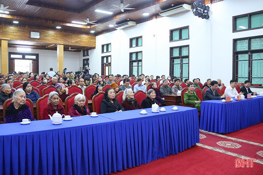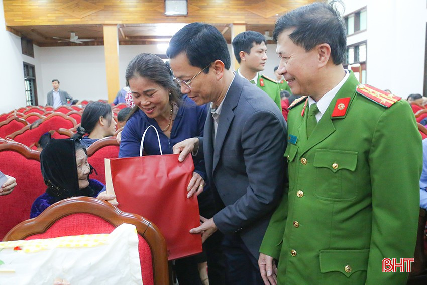 Phó Giám đốc Công an tỉnh Hà Tĩnh Đặng Hoài Sơn, Chủ tịch UBND TP Hà Tĩnh trao phần quà cho các mẹ liệt sỹ.