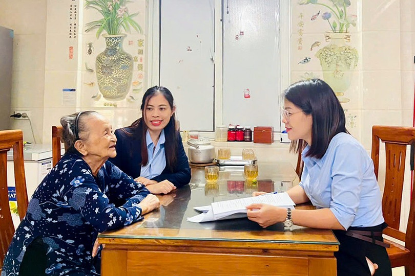 Viên chức Phòng Kế hoạch - Tài chính (BHXH tỉnh) phối hợp với BHXH huyện Thạch Hà khảo sát trực tiếp đối với người hưởng lương hưu trên địa bàn huyện.
