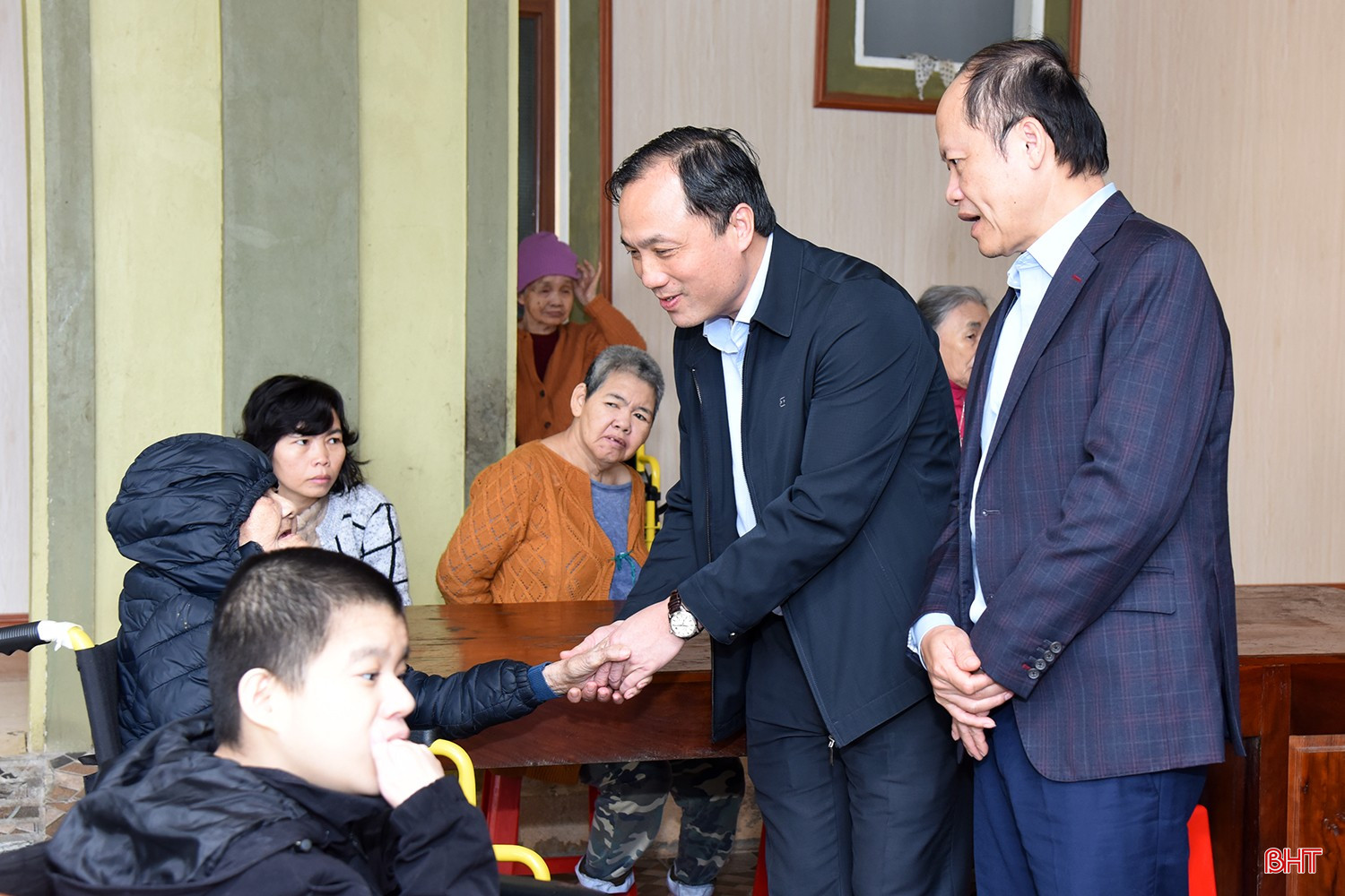Bí thư Tỉnh ủy Hoàng Trung Dũng, Phó Chủ tịch Thường trực UBND tỉnh Nguyễn Hồng Lĩnh ân cần thăm hỏi các cụ già, em nhỏ tại Trung tâm từ thiện Thiên Ân.