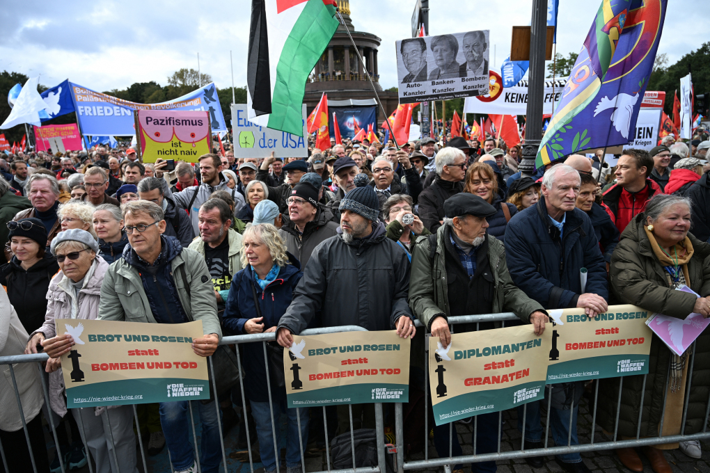 Cuộc biểu tình diễn ra ở thủ đô Berlin của Đức ngày 3/10 theo lời kêu gọi của một nhóm cực tả. Hàng nghìn người tham gia sự kiện đã giơ cao những biểu ngữ như "Đàm phán! Không vũ khí", "Nói không với chiến tranh", "Chủ nghĩa hòa bình không ngây thơ". Một số người còn cầm những tấm bảng với các dòng khẩu hiệu phản đối Mỹ.