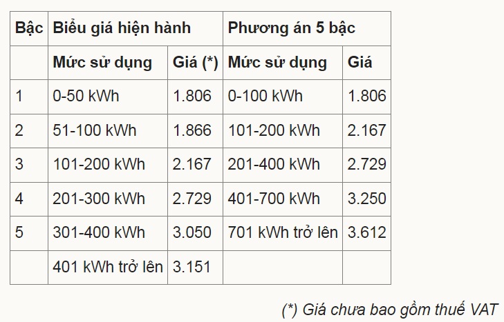 Theo phương án giá được Bộ Công thương đưa ra, giá điện các bậc thang 1-5 được tính bằng 90-180% giá bán lẻ điện bình quân 2.006,79 đồng một kWh (mức điều chỉnh từ ngày 9/11). Như vậy, giá thấp nhất (bậc 1) khoảng 1.806 đồng một kWh và cao nhất (bậc 5) là 3.612 đồng một kWh. Các mức giá này chưa bao gồm thuế VAT.