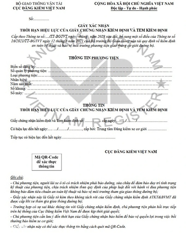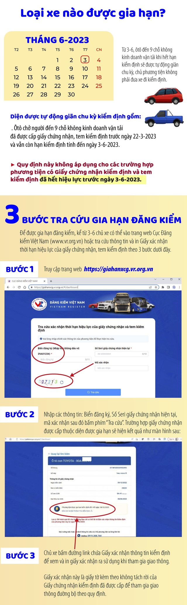 Để được gia hạn đăng kiểm, chủ xe có thể vào trang web Cục Đăng kiểm Việt Nam (www.vr.org.vn) để tra cứu thông tin và in Giấy xác nhận thời hạn hiệu lực của giấy chứng nhận, tem kiểm định. Giấy xác nhận này là giấy tờ kèm theo không tách rời của Giấy chứng nhận kiểm định đã được cấp để tham gia giao thông đường bộ theo quy định.