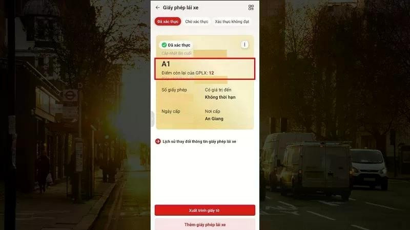 Bước 3: Sau khi việc xác thực hoàn tất, màn hình sẽ hiển thị đầy đủ thông tin về giấy phép lái xe của bạn bao gồm: Số giấy phép lái xe, Ngày cấp, nơi cấp, thời hạn hiệu lực của giấy phép và số điểm còn lại trên giấy phép, giúp bạn dễ dàng theo dõi và quản lý điểm số một cách dễ dàng.