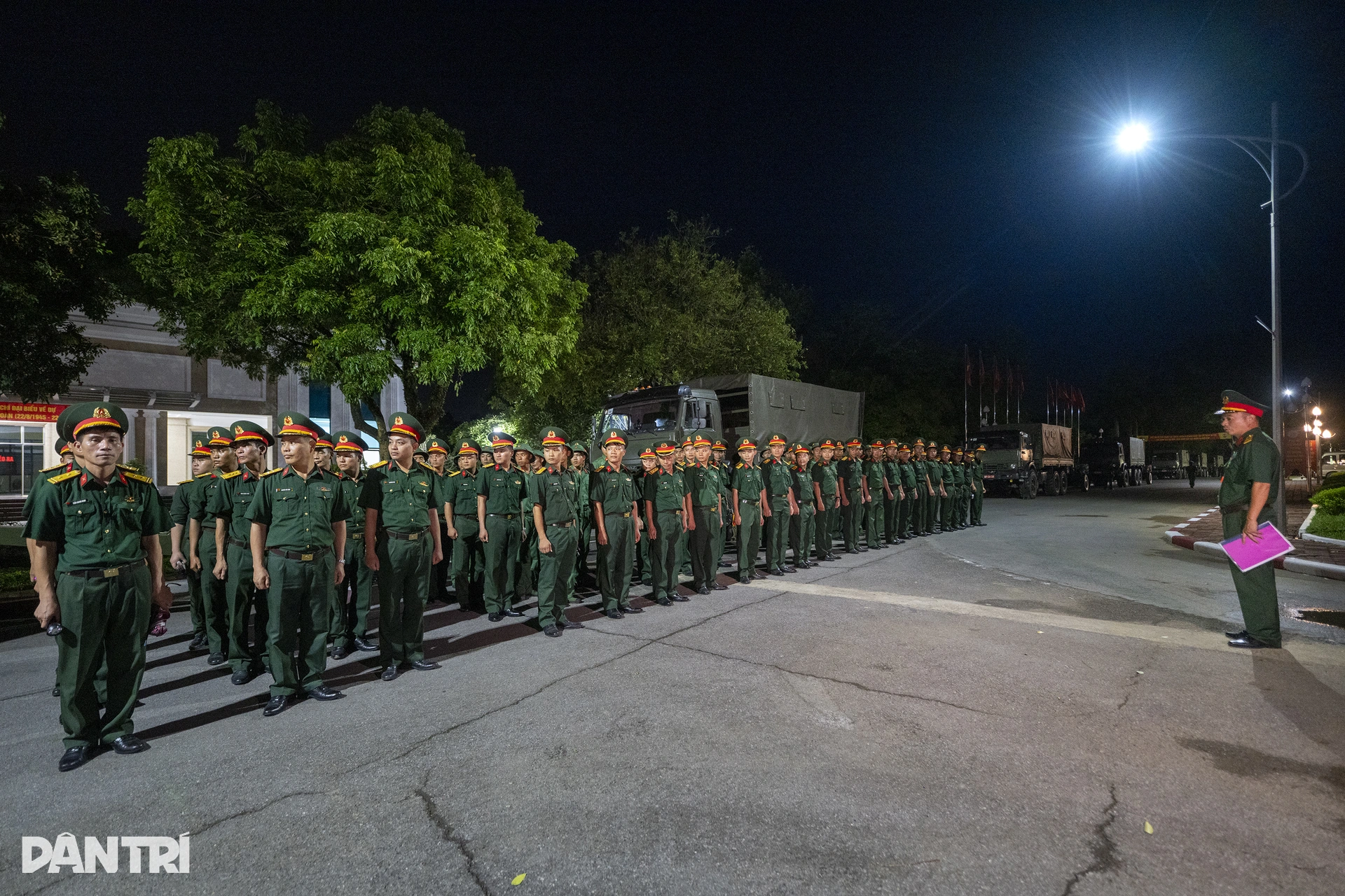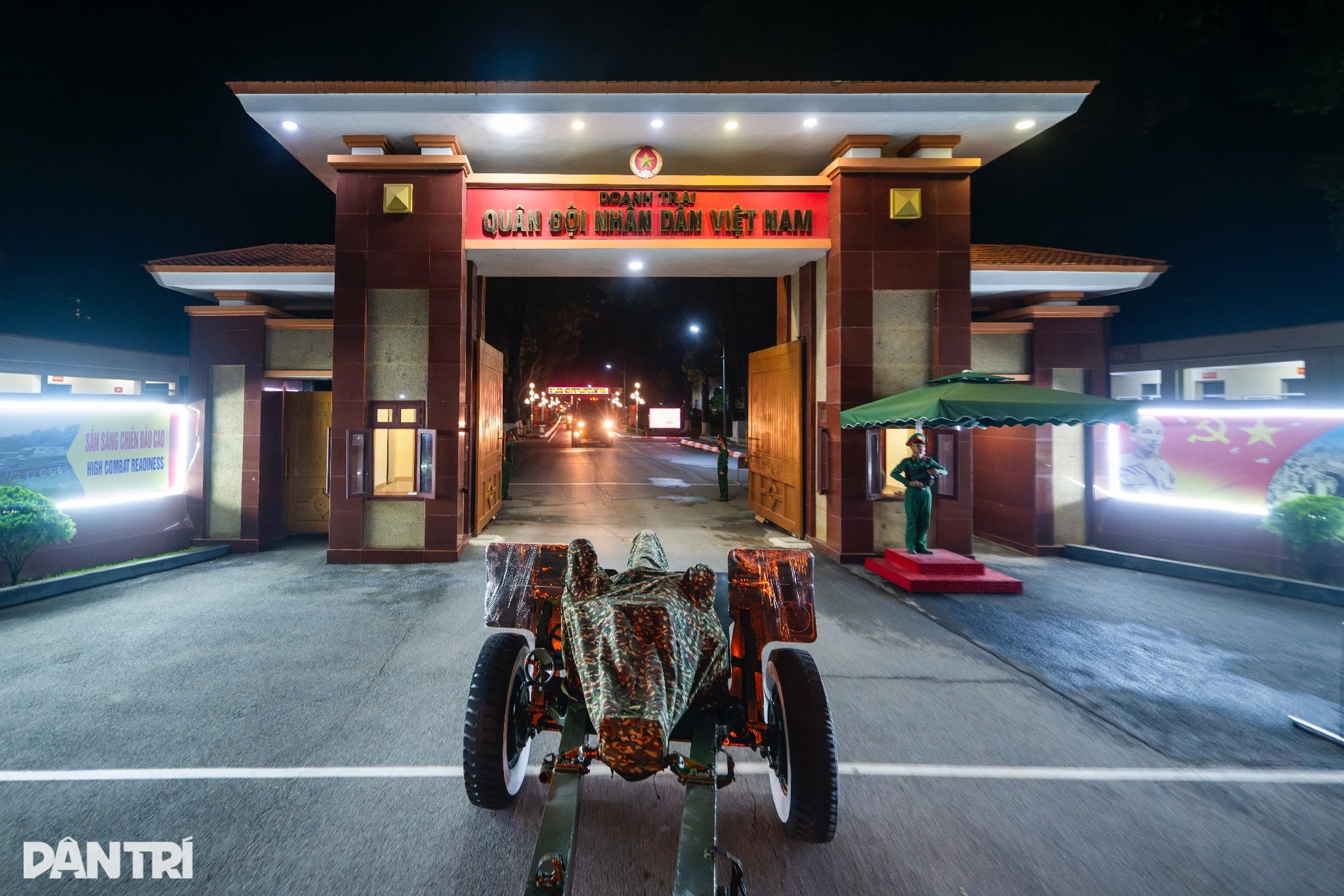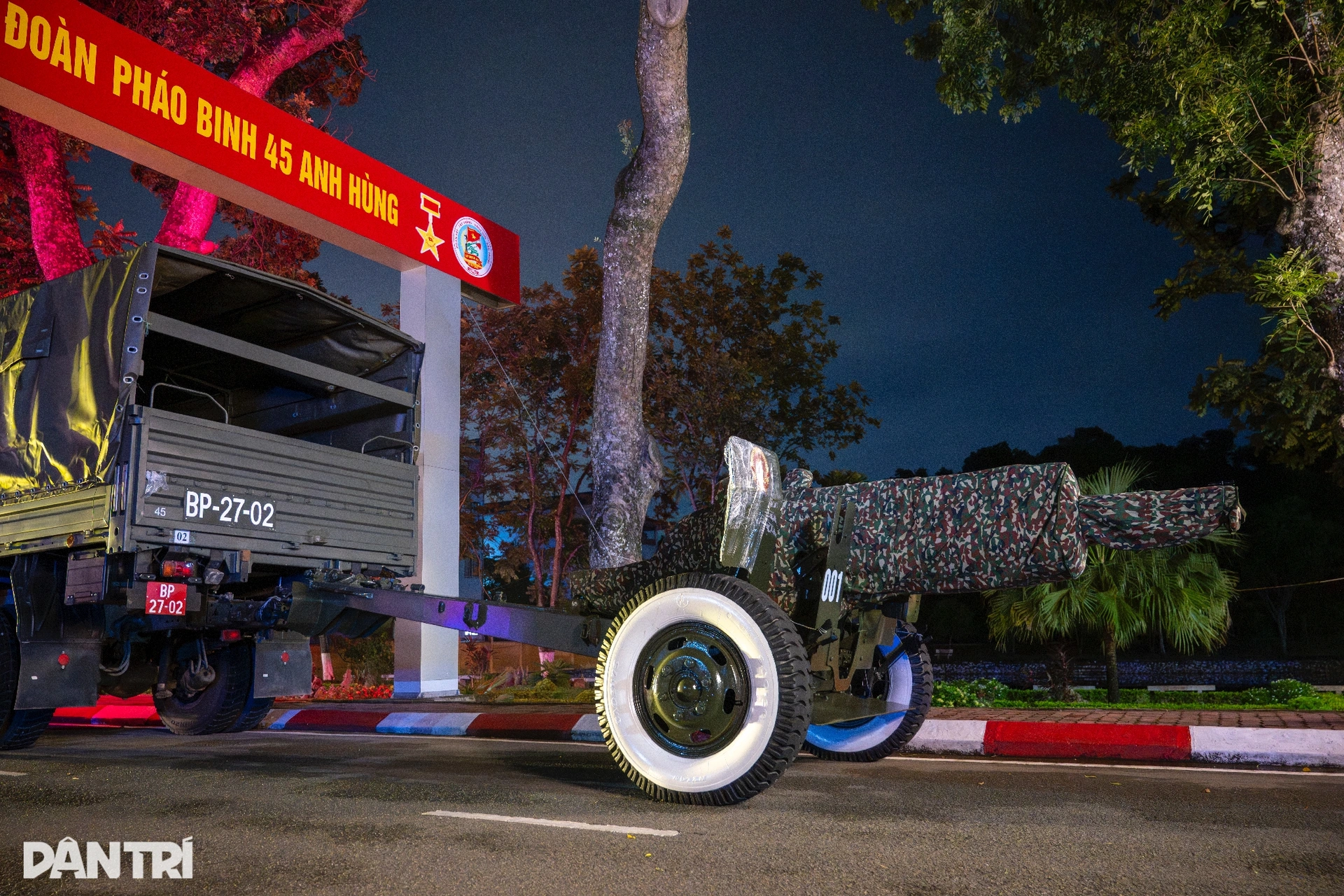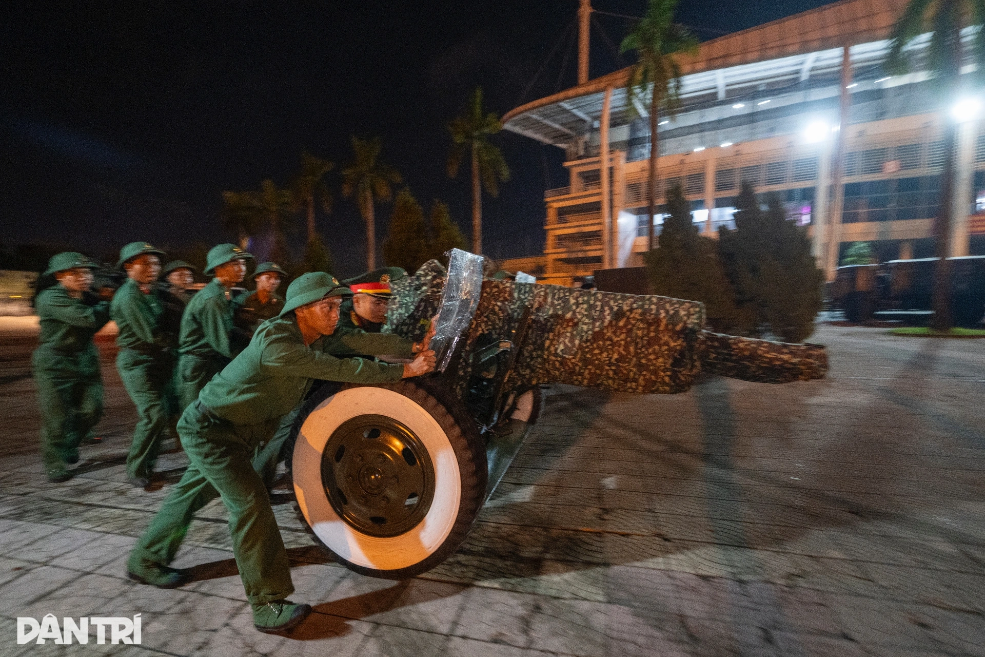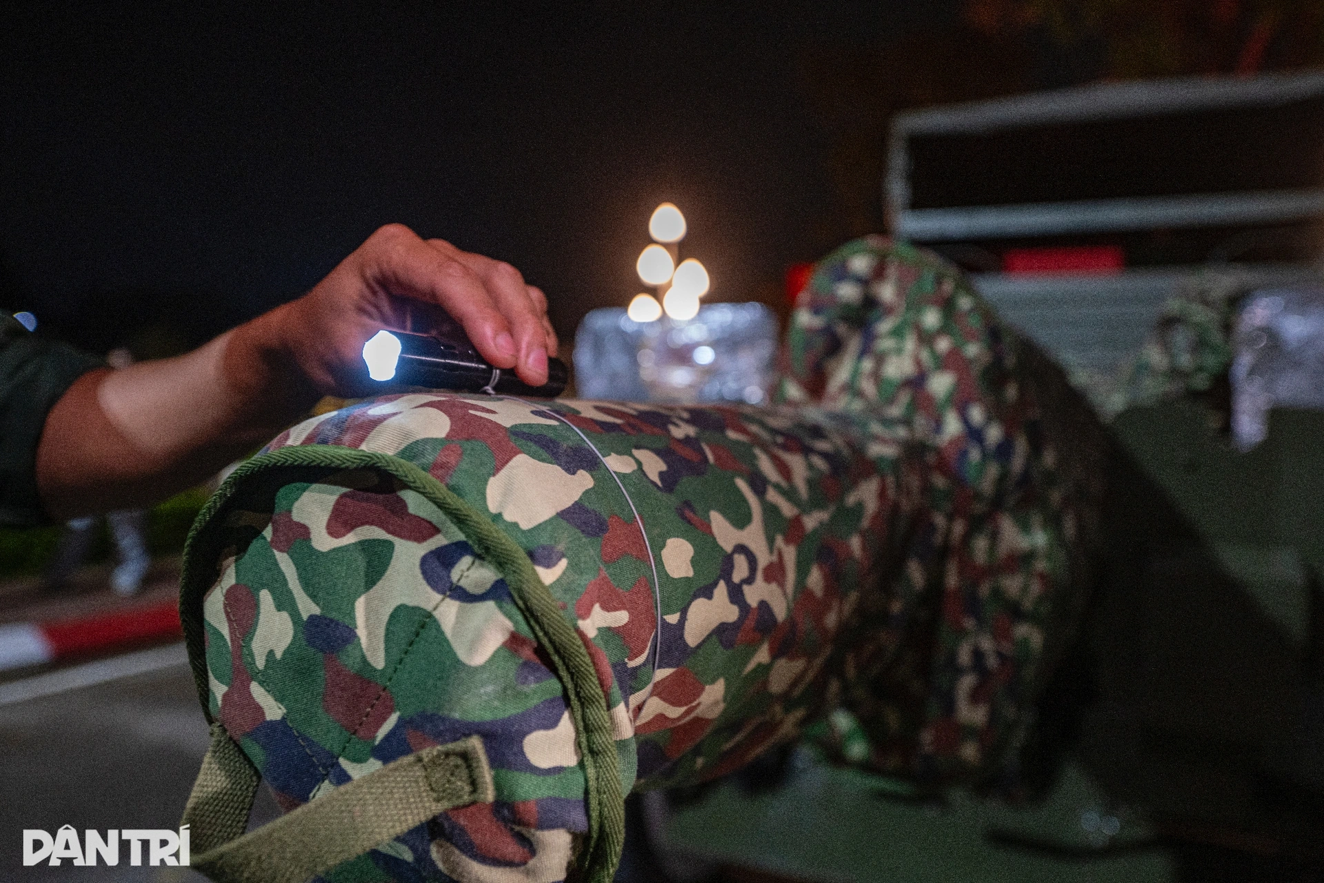 Chiến sĩ Nguyễn Văn Quyết (Pháo thủ số 2, Khẩu đội 2, Trung đội 1, Đội pháo lễ) tỉ mỉ kiểm tra lại từng chi tiết chằng buộc trước giờ hành quân. Đặc biệt, ở mỗi khu vực nòng pháo đều được gắn thêm một chiếc đèn pin chiếu sáng, vừa như tín hiệu dẫn đường, vừa đóng vai trò như đèn báo hiệu giúp các xe phía sau quan sát rõ ràng.