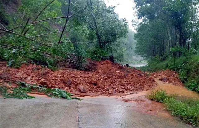 Tỉnh lộ 551 ở huyện Kỳ Anh (Nghệ An) bị sạt lở. Ảnh: Công Tường/TTXVN