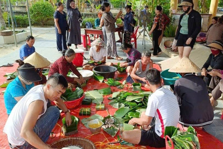 Người dân xã Kim Song Trường (Can Lộc) gói bánh chưng gửi ra miền Bắc yêu thương.