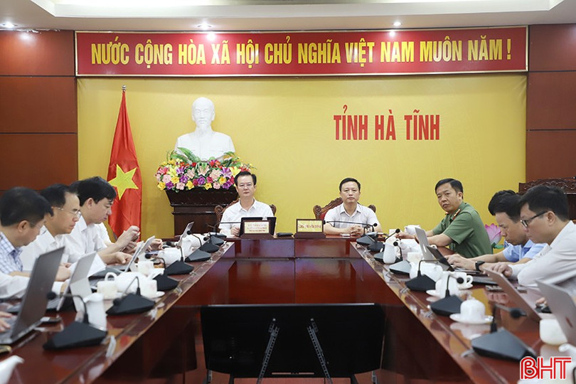 Phó Chủ tịch UBND tỉnh Trần Báu Hà và lãnh đạo Sở TT&TT điều hành tại điểm cầu Hà Tĩnh.