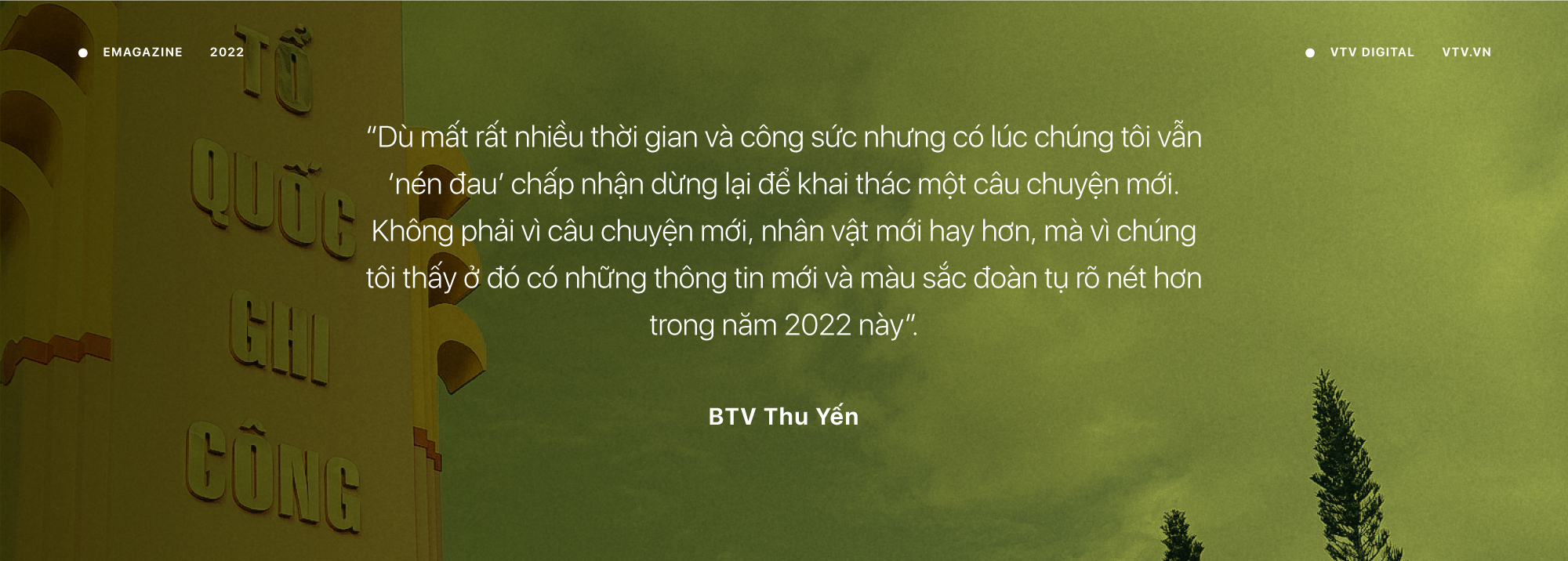 "Nói đến Quảng Nam, người ta nhớ tới câu ‘Dốc Quảng Nam, gan Cộng sản’ – mảnh đất mà mới nói đến tên thôi là đã thấy sự kiên cường của người Quảng hay những người con đã dừng chân ở đất Quảng Nam như thế nào" - BTV Thu Yến chia sẻ - "Còn Bình Định với vị trí đặc biệt là điểm cuối cùng trước khi tập kết vào chiến trường miền Nam, thế nên ở mảnh đất Bình Định, chúng tôi sử dụng từ ‘biệt ly’. Bình Định là mảnh đất năm xưa Bác Hồ đã biệt ly cha của mình để ra đi tìm đường cứu nước. Đây cũng là mảnh đất những người con chào tạm biệt gia đình và gần như trở thành lời biệt ly rất khó để gặp lại nhau sau chiến tranh. Những vùng đất có nhiều dấu tích chiến tranh như vậy sẽ kể rất nhiều câu chuyện cảm xúc".