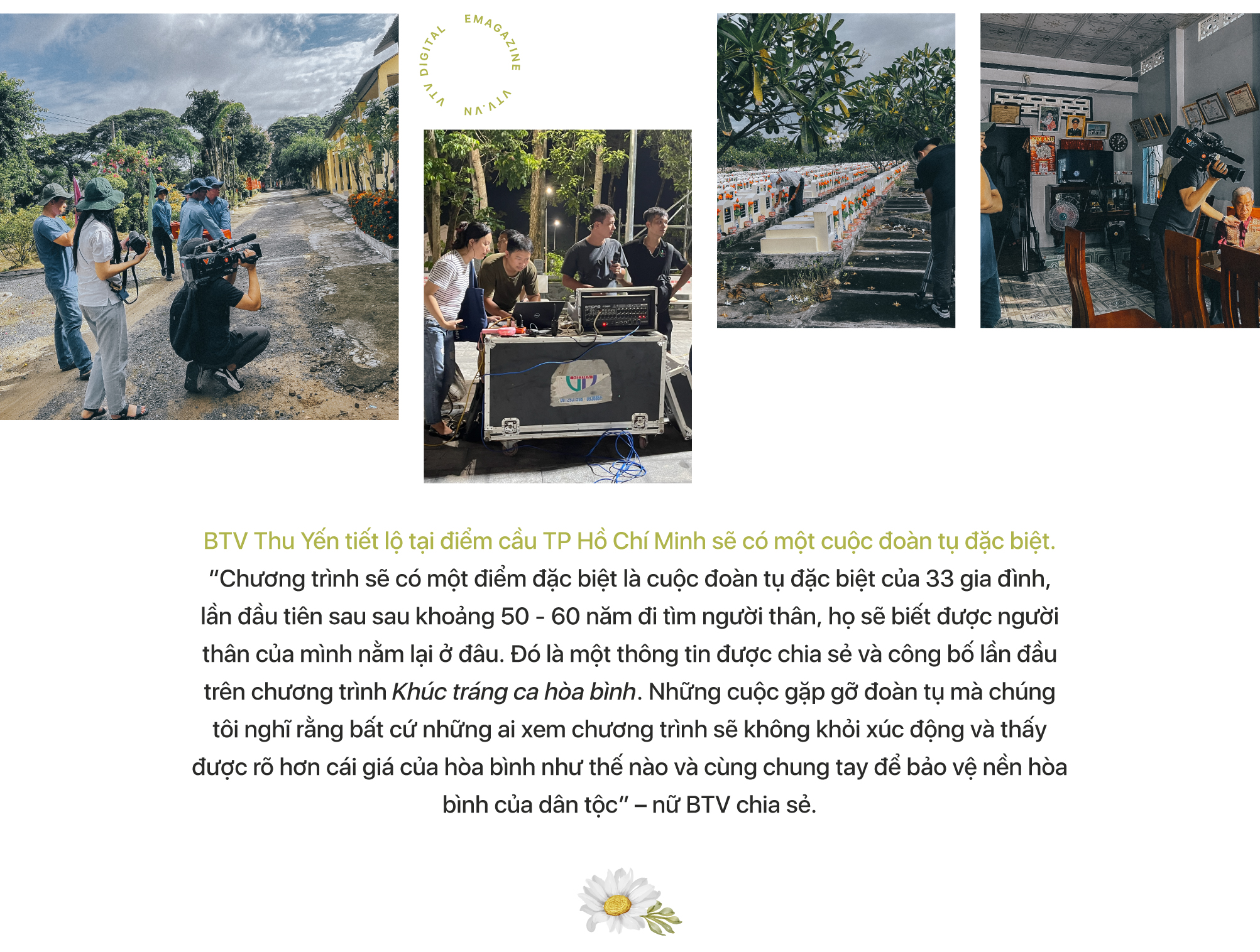 "Từ khóa ‘hòa bình’ sẽ được chúng tôi triển khai trong tất cả 3 chương của cầu truyền hình. Như ở chương đầu tiên là Những dấu chân hòa bình, nhìn lại bất cứ khi nào mà nền hòa bình bị đe dọa thì tất cả các thế hệ lại lên đường và họ để lại những dấu chân hòa bình ở trên khắp mọi miền Tổ quốc. Với điểm cầu Hà Nội, Quảng Nam, An Giang, TP Hồ Chí Minh…, những cái dấu chân hòa bình ấy đều rất rõ nét" - BTV Thu Yến, Ban Thanh thiếu niên chia sẻ.