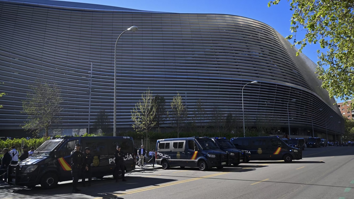 Lực lượng cảnh sát trước sân vận động Santiago Bernadeau ở Madrid, ngày 9/4/2024. Ảnh: France Info