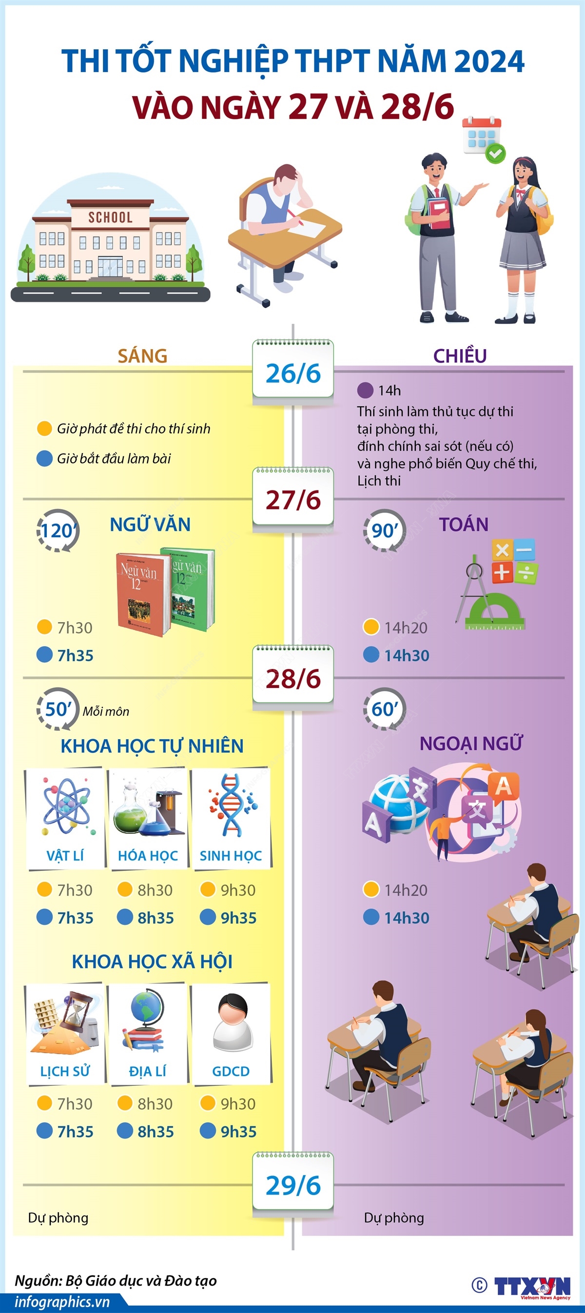 Cụ thể, ngày 26/6: làm thủ tục dự thi; ngày 27,28/6/2024: tổ chức coi thi; ngày 29/6/2024: dự phòng.