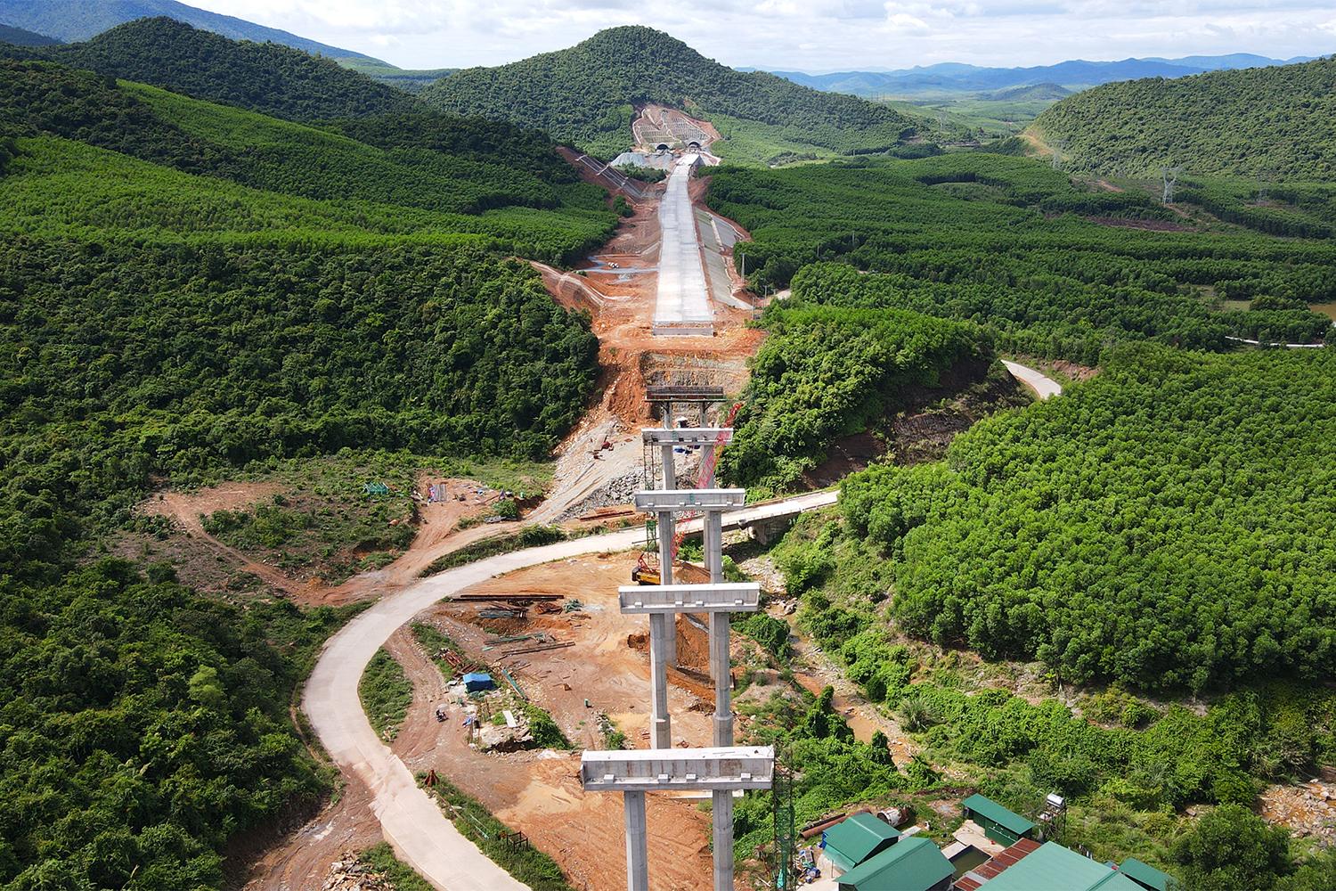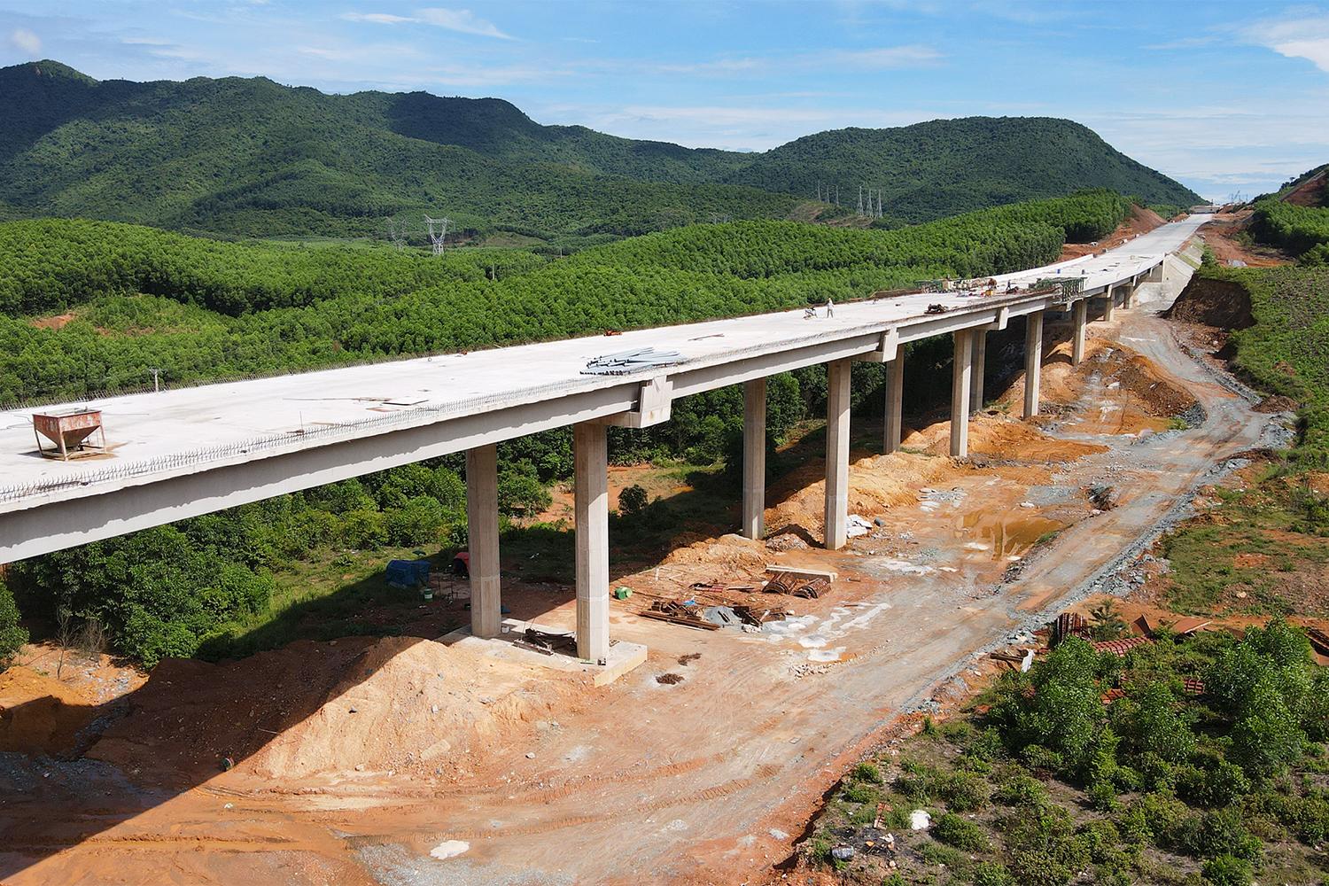 Sau gần 19 tháng kể từ ngày khởi công, tuyến cao tốc Vũng Áng - Bùng đã dần hình thành với tuyến chính được thi công cấp phối đá dăm gia cố xi măng và thảm lớp bê tông nhựa rỗng C25 cùng nhiều hạng mục hầm xuyên núi và cầu băng rừng, vượt sông.