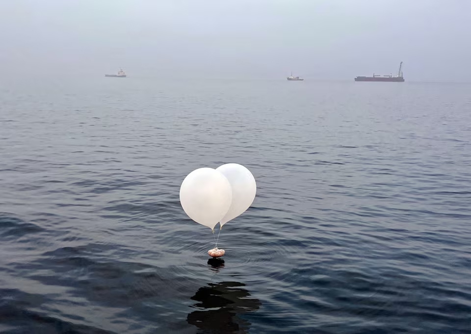Quả bóng bay mang nhiều vật thể trong đó có cả rác, được cho là thả từ Triều Tiên, xuất hiện trên biển ngoài khơi Incheon, Hàn Quốc, ngày 9/6/2024. Ảnh: Yonhap