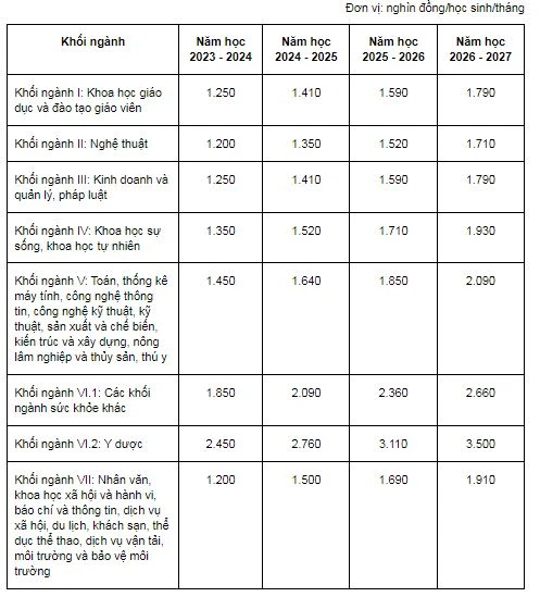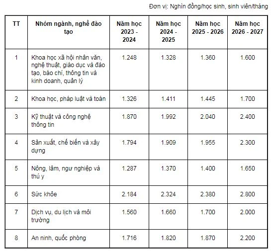 Theo đó, đối với cơ sở giáo dục nghề nghiệp công lập chưa tự bảo đảm chi thường xuyên, mức trần học phí từ năm học 2023-2024 đến năm học 2026-2027 như sau: