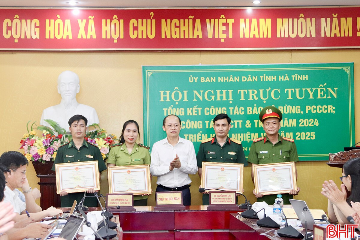 Dịp này, Phó Chủ tịch Thường trực UBND tỉnh Nguyễn Hồng Lĩnh và lãnh đạo các địa phương tại các điểm cầu đã trao bằng khen của Chủ tịch UBND tỉnh cho 4 tập thể và 5 cá nhân có thành tích xuất sắc trong công tác BVR-PCCCR năm 2024.