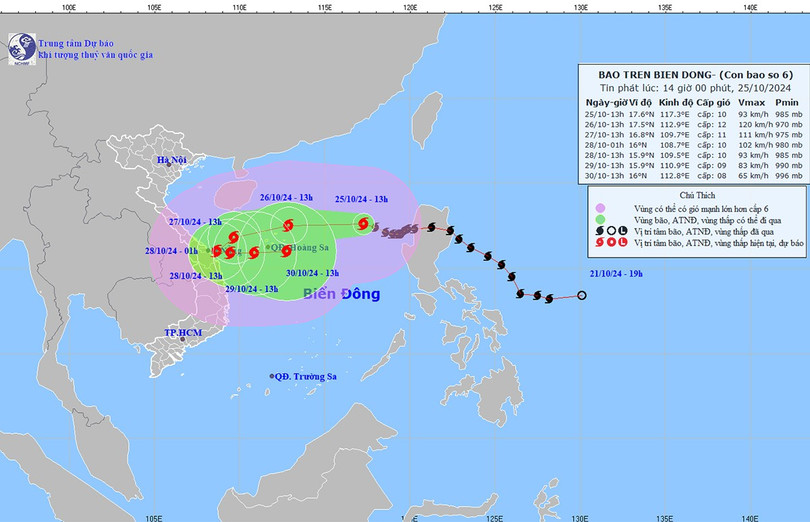 Theo Trung tâm Dự báo khí tượng thủy văn quốc gia, hồi 13h ngày 25/10, vị trí tâm bão ở vào khoảng 17,6 độ Vĩ Bắc; 117,3 độ Kinh Đông, trên vùng biển phía Đông của khu vực Bắc Biển Đông. Sức gió mạnh nhất vùng gần tâm bão mạnh cấp 10 (89-102km/h), giật cấp 12. Di chuyển theo hướng Tây Tây Bắc, tốc độ khoảng 15-20km/h.