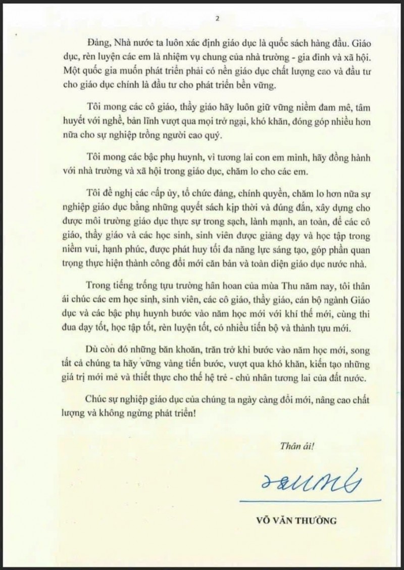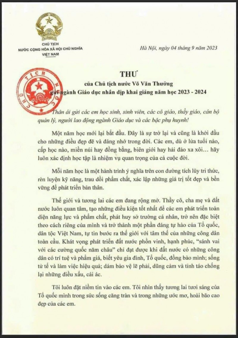 Sáng 5/9, 23 triệu học sinh cả nước khai giảng năm học mới 2022-2023, nhân dịp khai giảng năm học mới 2023-2024, Chủ tịch nước Võ Văn Thưởng đã gửi thư cho ngành giá