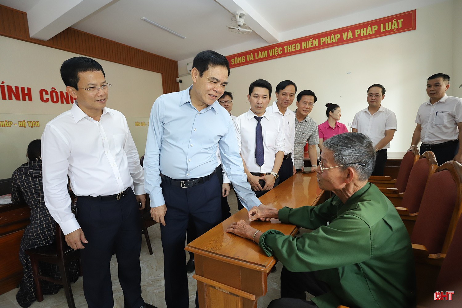 Chủ tịch UBND tỉnh Võ Trọng Hải trò chuyện với công dân xã Hà Linh về quá trình xử lý hồ sơ thủ tục tại Trung tâm Phục vụ hành chính công xã (Ảnh: BHT)