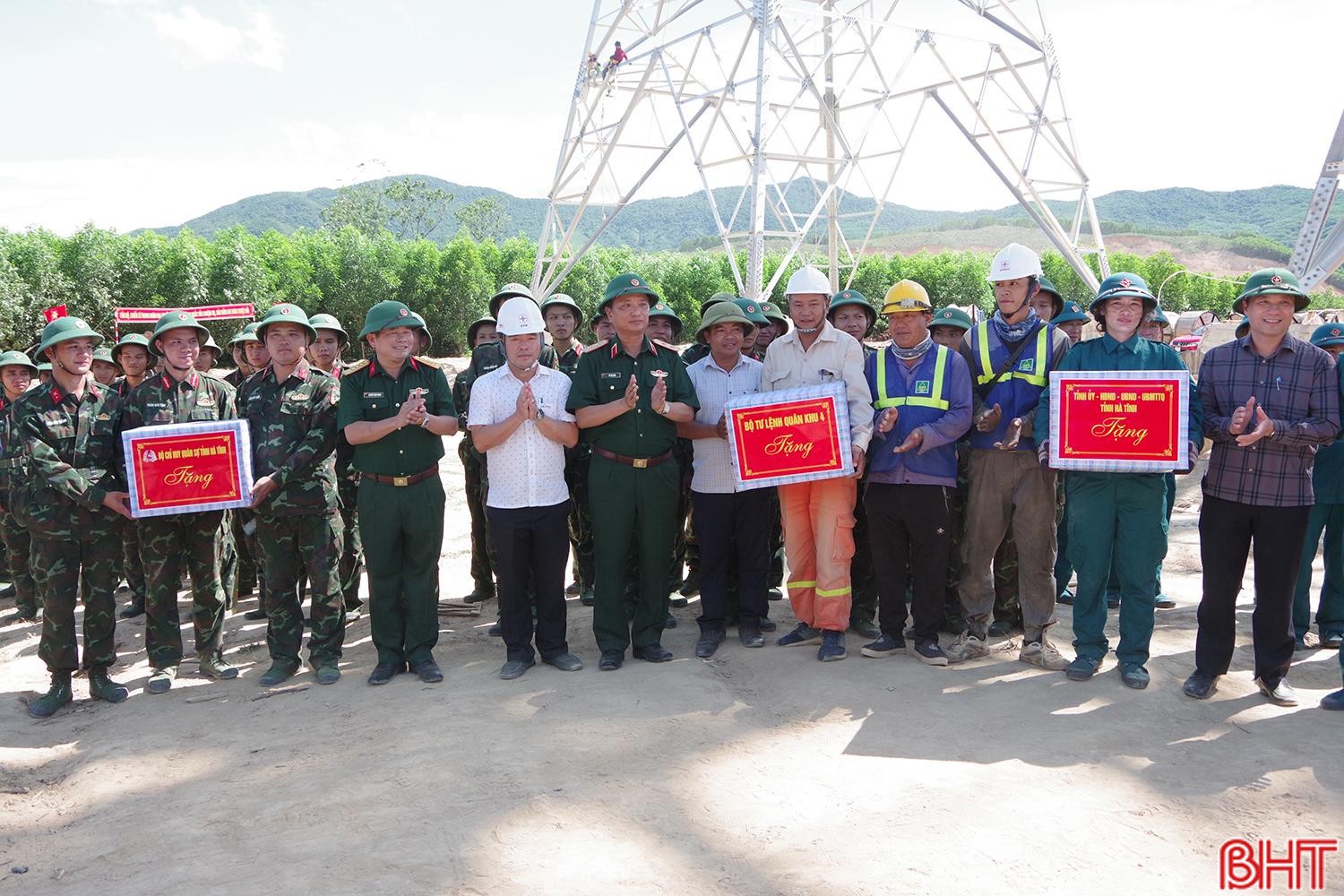 Trung tướng Hà Thọ Bình - Tư lệnh Quân khu 4, Bí thư Tỉnh ủy Hoàng Trung Dũng và lãnh đạo các cơ quan, đơn vị tặng quà động viên các lực lượng tham gia hỗ trợ thi công dự án đường dây 500 kV mạch 3.